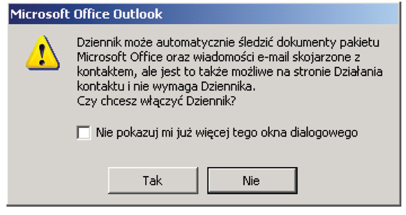 Jeśli zostanie wybrana opcja Nie, wówczas Outlook wyświetli dziennik, ale nie będzie dokonywał w nim żadnych wpisów. Jeśli zostanie wybrana opcja Tak, wówczas Outlook wyświetli okienko konfiguracji Dziennika.