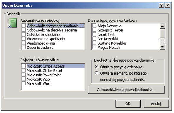 Okienko to można również wywołać w dowolnym momencie klikając w menu Narzędzia > Opcje… i wybierając przycisk Opcje dziennika…. Dziennik pozwala określić, które operacje będą zapisywane. Można na przykład określić, aby były rejestrowane kontakty e-mailowe z Janem Kowalskim oraz praca z dokumentami Word’a i Excel’a.