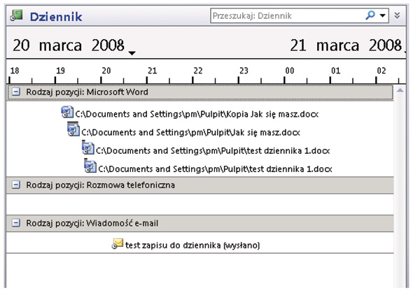 Najwygodniej, aby Outlook rejestrował wszystkie aktywności automatycznie i takie jest ustawienie domyślne, ale można również dokonywać wpisów w dzienniku ręcznie, przykładowo tych dotyczących rozmów telefonicznych albo pracy z programami, których Outlook nie potrafi automatycznie monitorować. Dziennik będzie swego rodzaju pamiętnikiem, w który można spojrzeć i zobaczyć, jak wyglądał dzień pracy i jakie czynności zostały wykonane.