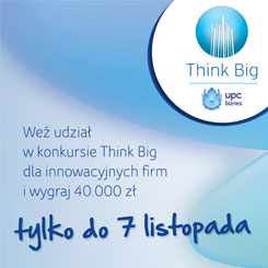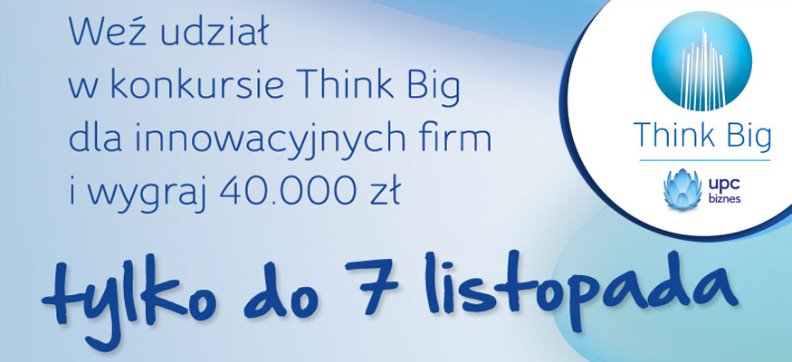 THINK BIG, czyli program dla małych firm z globalnymi ambicjami, zainicjowany przez UPC Biznes, skierowany jest do właścicieli mikro i małych przedsiębiorstw, którzy chcą rozwijać swoją działalność w oparciu o innowacyjne technologie i rozwiązania, a jednocześnie kreatywnie łączą swoje pasje z działalnością biznesową. Główną nagrodą w programie jest 40.000 złotych oraz możliwość wymiany wiedzy i doświadczeń z mentorami sektora innowacyjnego biznesu.