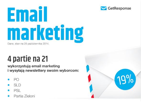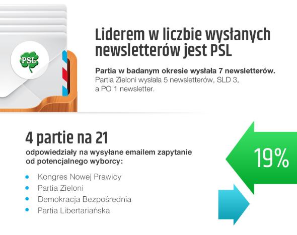 Email marketing jest zaniedbywanym narzędziem komunikacji wśród partii politycznych. Niewiele zmieniło się w stosunku do wyników poprzedniego raportu. Newslettery wysyłają cztery partie (w 2011 tylko dwie). Liderem w liczbie wysłanych newsletterów okazał się PSL. Partia w badanym okresie wysłała siedem newsletterów, dla porównania - PO tylko jeden. Partie polityczne równie rzadko odpowiadają na maile, do tego na odpowiedź czasami trzeba poczekać nawet 5 dni.