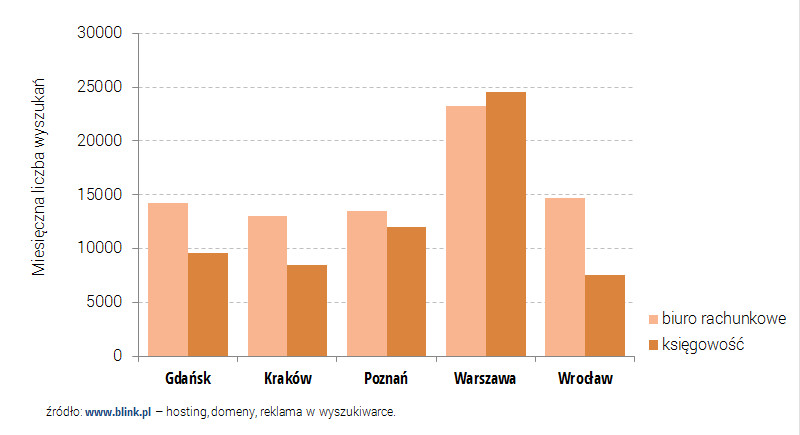 Jak się okazało, największy popyt na pełną księgowość jest w Warszawie, z kolei najmniej zapytań pojawia się wśród internatów mieszkających w Poznaniu. Podobnie w przypadku „doradztwa podatkowego” – najwięcej zapytań pojawia się w Warszawie, choć znaczny popyt na ofertę obejmującą tę usługę występuje także w Krakowie oraz Gdańsku.