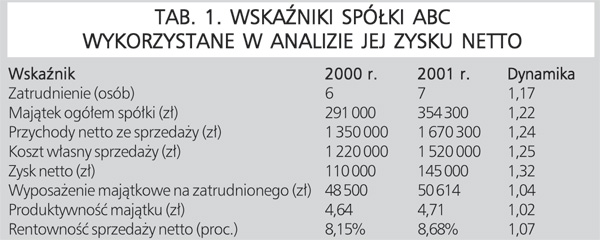 Przeprowadźmy analizę zysku netto w powiązaniu z oceną efektywności gospodarowania czynnikami produkcji, posługując się danymi spółki ABC, zawartymi w tabeli 1.