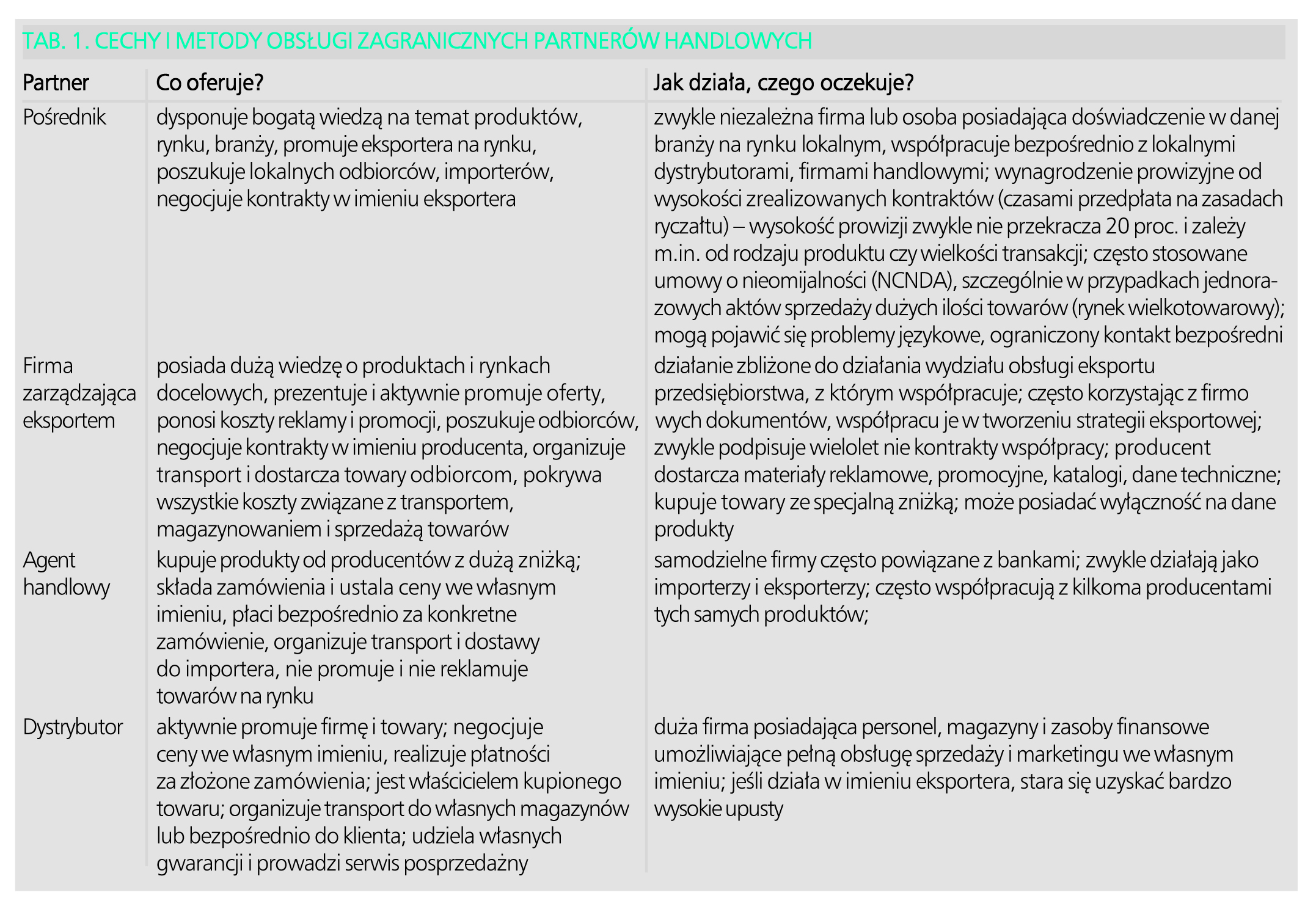W tabeli nr 1 przedstawiłem niektóre cechy i stosowane metody obsługi czterech wyróżnionych typów zagranicznych partnerów handlowych.