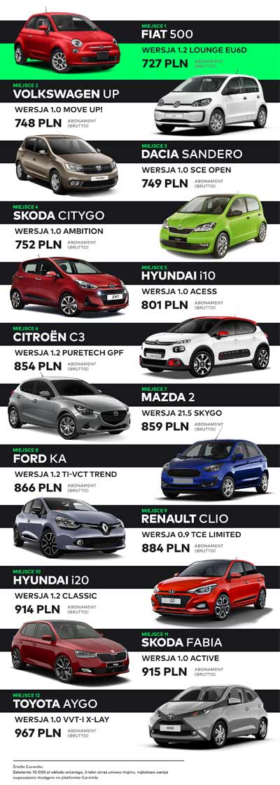 Ranking zamykają trzy auta, za które zapłacimy miesięcznie ponad 900 zł. Są to Hyundai i20, Skoda Fabia oraz najdroższa z najtańszych – Toyota Aygo.