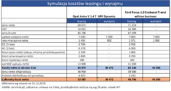 Analitycy Carsmile zrobili to na przykładzie dwóch popularnych na polskim rynku modeli: Opla Astry V oraz Forda Focusa Ecoboost Trend. W zestawieniu ujęli koszty ubezpieczenia, opon, serwisów i rejestracji. Pominęli natomiast koszty paliwa, które nie mają wpływu na wynik symulacji, gdyż są takie same, niezależnie od tego, czy wybierzemy leasing, czy wynajem.