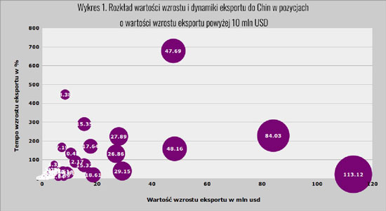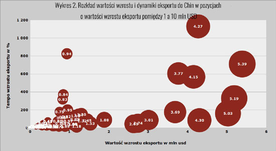 Dla oceny atrakcyjności danej grupy produktowej pod względem eksportu do Chin istotnych jest wiele czynników, pośród których jednym z ważniejszych i bardziej obrazowych jest kombinacja wzrostu wartości i tempa wzrostu eksportu. Na przedstawionych wykresach zaprezentowana została relacja tych dwóch wartości na poziomie pozycji. Wielkość „bańki” jest zdeterminowana przez wielkość wzrostu eksportu.
