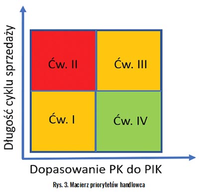 W ćwiartce IV tej macierzy znajdują się potencjalni klienci o najwyższym stopniu dopasowania do PIK oraz pilnej potrzebie zakupowej. Prawdopodobieństwo pozytywnego zamknięcia sprzedaży z tymi klientami jest największe. Decyzja jest więc prosta i oczywista. Chcesz więcej sprzedawać? Chcesz pomóc handlowcom zrealizować plan sprzedaży, zadbaj o to, aby w końcówce roku zajmowali się tylko potencjalnymi klientami z ćwiartki IV.