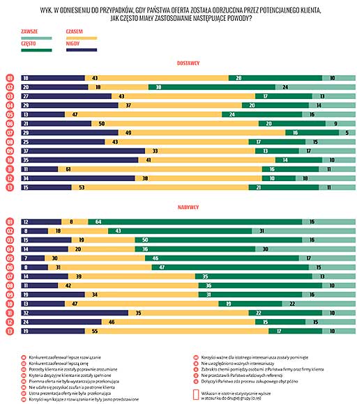 Zwróćmy uwagę, że dominującym przekonaniem dostawców o powodach odrzucenia ich ofert jest cena. 24 proc. z nich odpowiedziało, że jest to powód, który występuje „zawsze” a 38 proc. z nich uważa, że powód ten często determinuje decyzje nabywców. Razem daje to 62 proc. respondentów od strony dostawców.