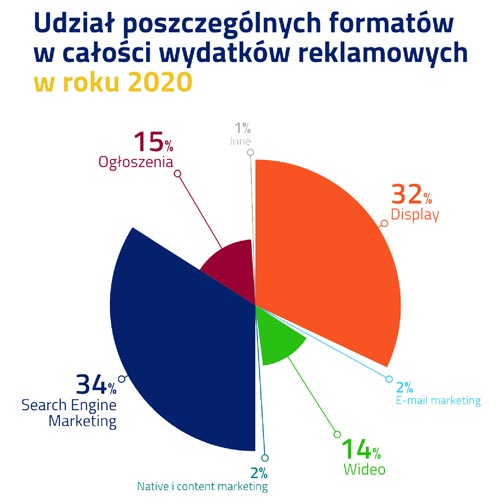 Drugie miejsce, z udziałem 32 proc. zajmuje reklama displayowa, której udział zwiększył się o 3 proc. rok do roku. Podobny wzrost odnotował także format wideo – osiągając 14 proc. udziału wśród wydatków reklamowych.