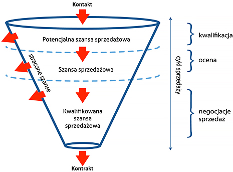 Zacznijmy od definicji, co to jest lejek sprzedaży? Otóż lejek sprzedaży to graficzne przedstawienie procesu sprzedaży, czyli sekwencji czynności, które handlowiec powinien wykonać, aby zamienić kontakt w kontrakt (rys. 1). Dlaczego warto regularnie robić przegląd lejków sprzedaży handlowców? Z dwóch powodów: