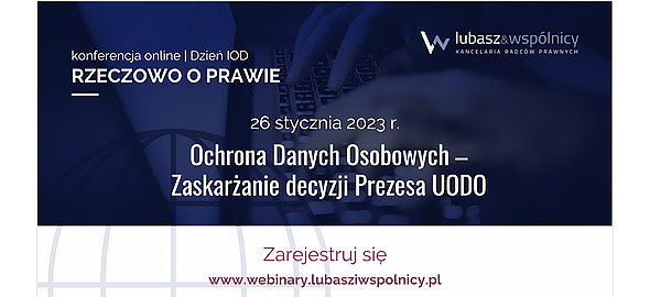 W dniu Inspektorów Ochrony Danych (26.01.2023 r.) odbędzie się Konferencja Rzeczowo o Prawie "Ochrona Danych Osobowych - Zaskarżanie decyzji Prezesa UODO" zorganizowana przez Kancelarię Radców Prawnych - Lubasz i Wspólnicy. Wydarzenie obejmie część wykładową i panel dyskusyjny, w których udział wezmą uznani eksperci z dziedziny ochrony danych osobowych. Konferencja będzie miała miejsce w przestrzeni online, a udział w niej ma charakter otwarty i bezpłatny.
