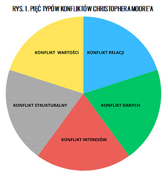 Jeden z najpopularniejszych podziałów konfliktów pod względem przyczyn i charakteru zaproponował Christopher Moore, dzieląc konflikty na pięć typów (rys. 1.):