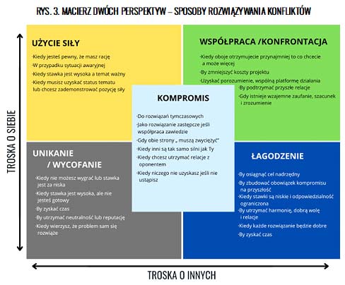 W tym miejscu chcę zwrócić uwagę menadżerów na macierz dwóch perspektyw (dual-concern, twórcy Langton/Sadri). Model ten (rys. 3.) opisuje sposoby rozwiązywania konfliktów poprzez dwie perspektywy: „Troski o siebie” (oś Y) oraz „Troski o innych” (oś X).