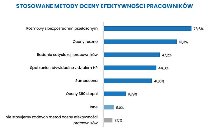 Z drugiej strony warto zauważyć, że względnie wysokie wyniki uzyskały także takie odpowiedzi jak badania satysfakcji pracowników i indywidualne spotkania z HR. To pokazuje, że organizacje stają się świadome, jak ważne jest całościowe podejście do pracownika, które wykracza poza standardową ocenę efektywności.