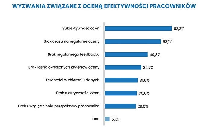 53,1 proc. przebadanych HR-owców wskazało również, że przy ocenie pracowników trudności wiążą się z brakiem czasu na regularne przeprowadzanie ewaluacji. Kolejnym często wymienianym problemem był brak regularnego feedbacku (40,8 proc. wskazań). Dodatkowym wyzwaniem, wskazanym przez 34,7 proc. respondentów, jest brak jasno określonych kryteriów ocen, co prowadzi do różnic w sposobie oceniania pracowników i obniżenia przejrzystości przeprowadzanych ocen.