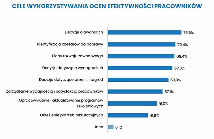 Oceny efektywności pracowników pełnią wiele ważnych funkcji w organizacjach, począwszy od decyzji o awansach, przez planowanie rozwoju zawodowego, aż po analizę potrzeb rekrutacyjnych. W badaniu niemal 76,5 proc. respondentów wskazało, że wyniki ocen efektywności służą głównie podejmowaniu decyzji o awansach – co oznacza, że ankietowani w dużej mierze polegają na formalnych ocenach przy planowaniu ścieżek kariery pracowników.