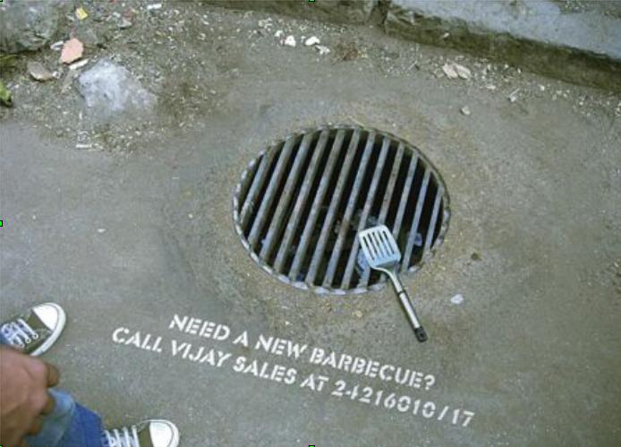 Rysunek. Przykład marketingu partyzanckiego – wykorzystanie studzienki kanalizacyjnej, jako reklamy sklepu z grillami