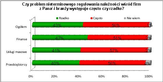 Ponad połowa firm twierdzi, że problem nieterminowego regulowania należności wśród firm z ich branży występuje często. Najczęściej problem nieterminowych płatności dostrzegają dostawcy usług masowych, czyli firmy takie jak: operatorzy telekomunikacyjni, dostawcy energii, gazu, telewizji kablowej, Internetu, a także firmy wodociągowe i przedsiębiorstwa komunikacji miejskiej.