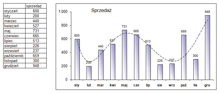 Excel ma możliwości wyznaczenia linii trendu (linii regresji) na wykresie punktów. Można także wyświetlić wzór takiej krzywej. Krzywa wyznacza wartość trendu dla poszczególnych danych. Na naszym wykresie linia trendu przypomina swoją krzywizną funkcje cosinus.