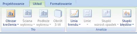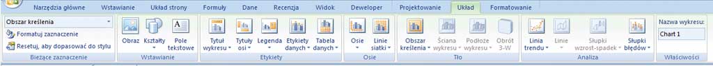 Ostatnia zakładka Układ – narzędzi wykresów daje możliwość zmiany poszczególnych elementów wykresu. Są to etykiety: tytuł wykresu, legenda, tytuły osi, etykiety danych, tabele danych, zmiana osi, linii siatki, obszaru kreślenia, linii trendu aż po opcję pozwalającą nadać nazwę dla naszego wykresu.