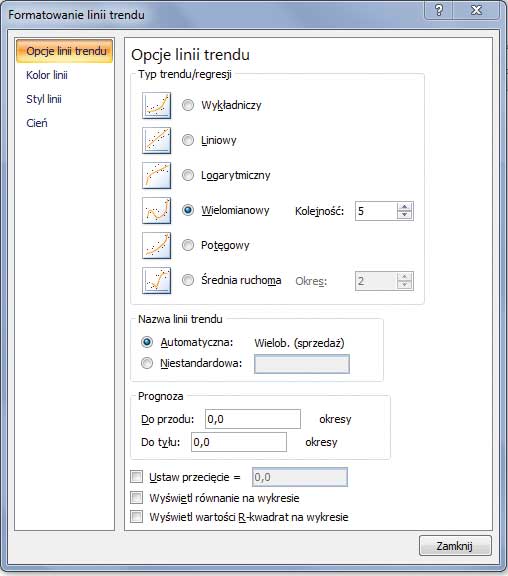 Po wybraniu linii trendu mamy też możliwość edycji trendu. Można tu zmienić choćby typ trendu.
