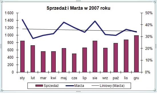 W przedstawionym wyżej przypadku mamy do czynienia z tabelą, w której mamy także zastosowaną funkcję sumowania sprzedaży i wyliczania średniej marży. Uwzględnienie powyższego wiersza i pokazanie go na wykresie może zamazać prawdziwy obraz sprzedaży czy średniej marży. Warto mieć to na uwadze podczas tworzenia wykresu i wybierać dane, które będą miały wpływ na widoczny wykres.