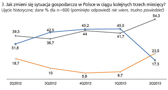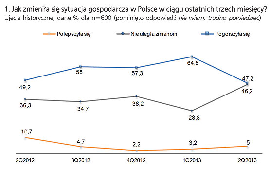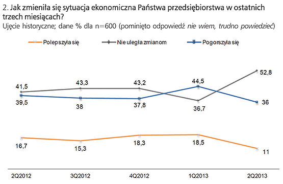 Ponad 47 proc. przedsiębiorców uważa, że kondycja gospodarcza Polski w poprzednich trzech miesiącach uległa pogorszeniu. Tym samym zmniejszył się odsetek pesymistów w stosunku do ubiegłego kwartału (wówczas 64,8 proc.) oraz w relacji do drugiego kwartału roku ubiegłego (kiedy 49,2 proc. tak właśnie oceniała sytuację).