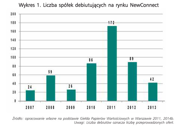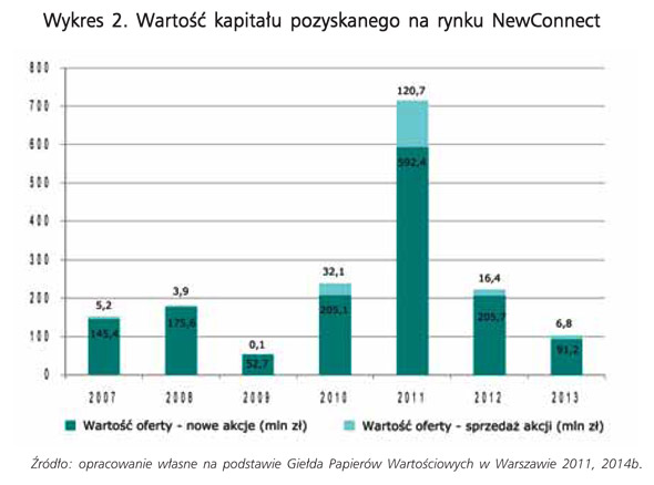 W sumie na rynku NewConnect od początku jego funkcjonowania – 30 sierpnia 2007 – do końca 2013 roku spółki pozyskały ponad 1,4 mld zł, a dodatkowo w momencie debiutu dotychczasowi właściciele sprzedali akcje o wartości ponad 185 mln zł (z tego 85 mln zł przypada na właścicieli jednej spółki TMS Brokers, która zadebiutowała w 2011). W przypadku zdecydowanej większości debiutów kwota pozyskanego kapitału do spółki była mniejsza niż 3 mln zł (najczęściej wartość emitowanych akcji wprowadzanych do obrotu przez spółkę nie przekraczała 1 mln zł)(1). Jednoznacznie wskazuje to na wyspecjalizowanie się tej części rynku kapitałowego w obsłudze małych podmiotów.