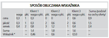 (np. od –3 do +3). Jeśli jedne cechy wpływają w większym stopniu na decyzje zakupowe niż inne, wówczas konieczne jest przypisanie im odpowiednich wag (z przedziału od 0 do 1). Im cecha ważniejsza, tym waga będzie większa. Suma wag winna wynieść 1. Sposób obliczenia wskaźnika prezentuje tabela.