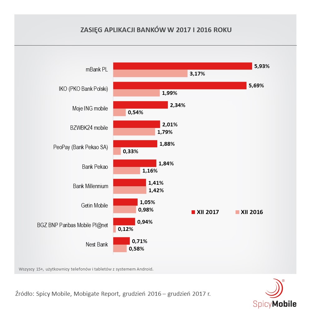 W analizowanym okresie największą popularnością cieszyły się dwie aplikacje: mBank (5,93%) oraz IKO (aplikacja PKO Banku Polskiego – 5,69%). Pierwszą trójkę zamyka  aplikacja ING mobile (2,34%). Warto przy tym zaznaczyć, że wśród dziesięciu topowych aplikacji bankowych według zasięgu niemal wszystkie z wyjątkiem jednej odnotowały wzrosty, przy czym mówimy tutaj o znaczących skokach popularności – w wielu przypadkach wynoszących kilkaset procent.