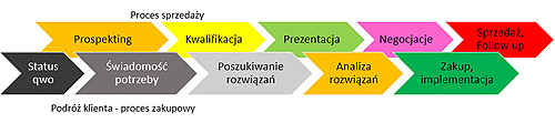 z procesem zakupowym klienta, zadbaj o to, żeby na poszczególnych etapach opisane były cele, które handlowiec powinien osiągnąć z potencjalnym klientem, a nie zadania, które powinien wykonać, jak jest w tradycyjnym procesie sprzedaży.