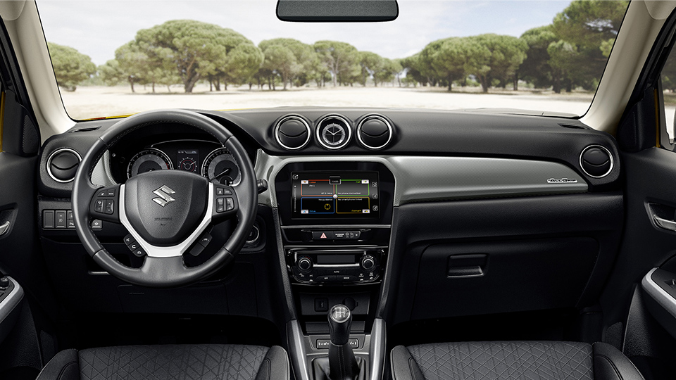Co do stylistyki wnętrza, Suzuki postawiło na proste formy i surowe wykończenie. Największą ekstrawagancją kokpitu jest analogowy zegar na desce rozdzielczej, wkomponowany między kratki wlotu powietrza. Na desce, ozdobionej matowymi chromami, ponadto znajdziemy wielofunkcyjny ekran dotykowy oraz panel do sterowania klimatyzacją z dwiema gałkami i małym wyświetlaczem.