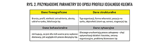 Samo określenie segmentu, w którym twoi handlowcy powinni szukać szans sprzedaży to za mało. Badania pokazują, że w każdym segmencie tylko około 3 proc. firm jest zdecydowanych na zakup, 7 proc. firm rozważa zakup, a 30 proc. jeszcze się nie zdecydowało. Aby szybko dotrzeć do tych 10 proc. firm, handlowcy powinni otrzymać od ciebie zestaw parametrów firmograficznych i strukturalnych oraz behawioralnych i sytuacyjnych (rys. 2.) opisujących Profil Idealnego Klienta twojej firmy.