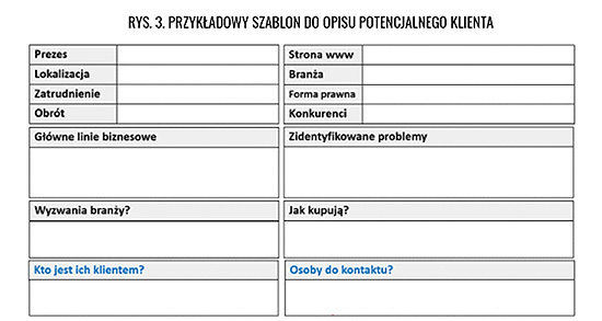 Parametry te ułatwiają handlowcom wybór potencjalnych szans sprzedażowych z bazy kontaktów oraz wstępną ich kwalifikację. Sugeruję także, abyś oprócz powyższych parametrów przygotował szablon do opisu potencjalnego klienta (rys. 3.).